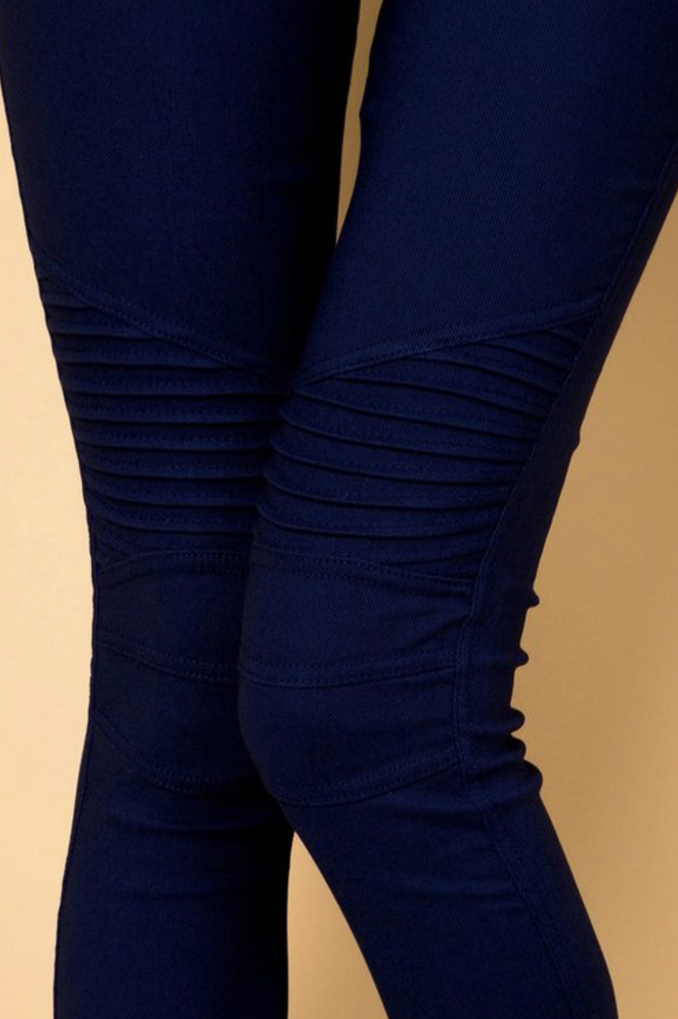 Stretchy pull on pant featuring ribbed detail on thigh. Super fashionable moto pant.