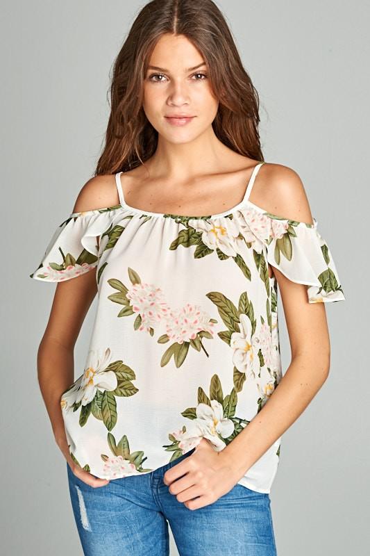 Puff Chiffon Flower Print Cold Shoulder Ruffle Sleeved Blouse with Adjustable Straps and Gold Button