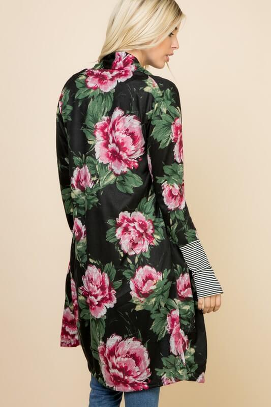 FLORAL PRINTED OPEN FRONT CARDIGAN WITH STRIPED THUMBHOLE CUFF DETAILING