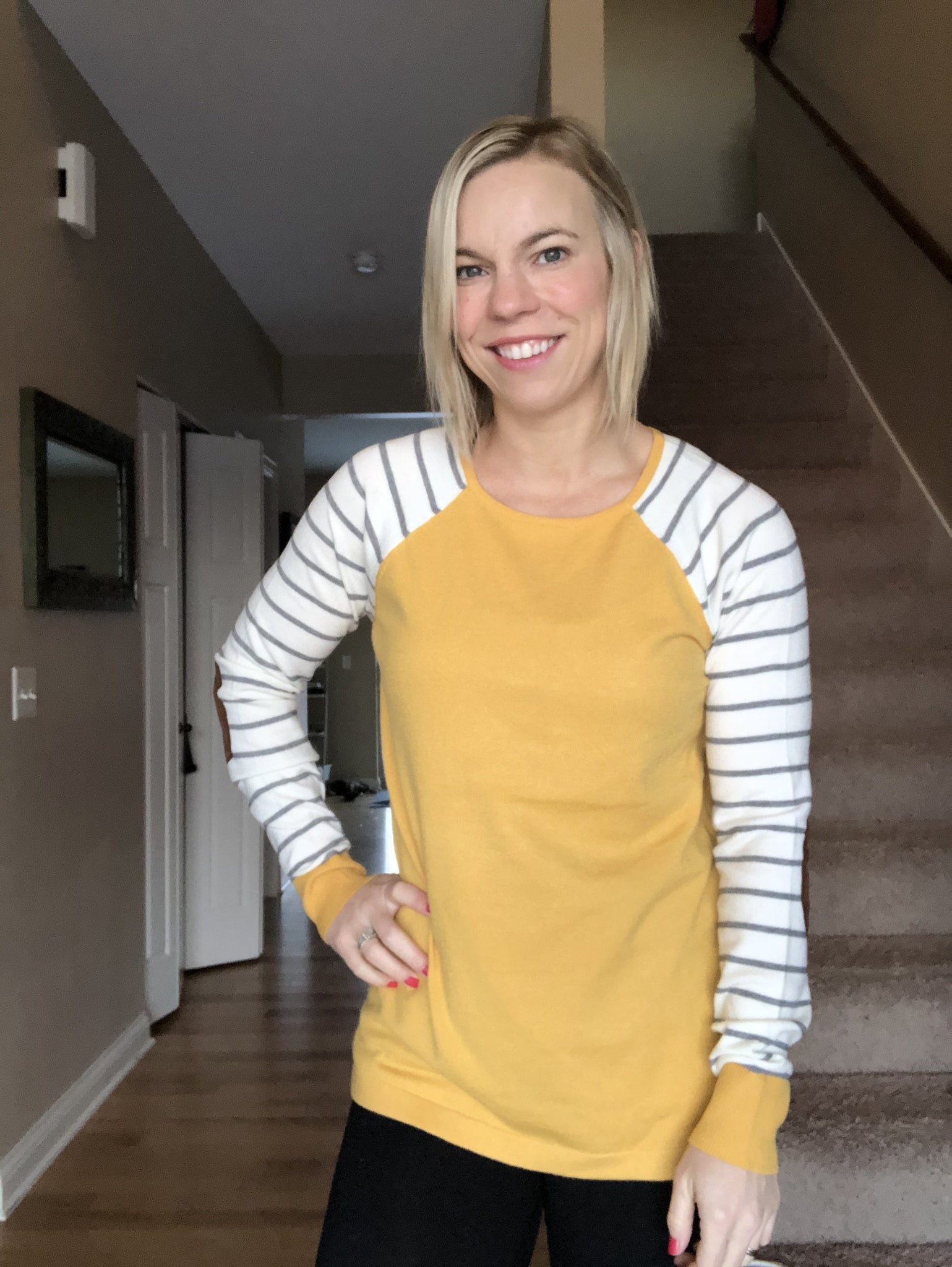 Soft and cozy with a trendy mustard colored body! The elbow patch adds a super cute touch!! You will love how comfortable and nice this feels on! This brand runs true to size with a relaxed fit.